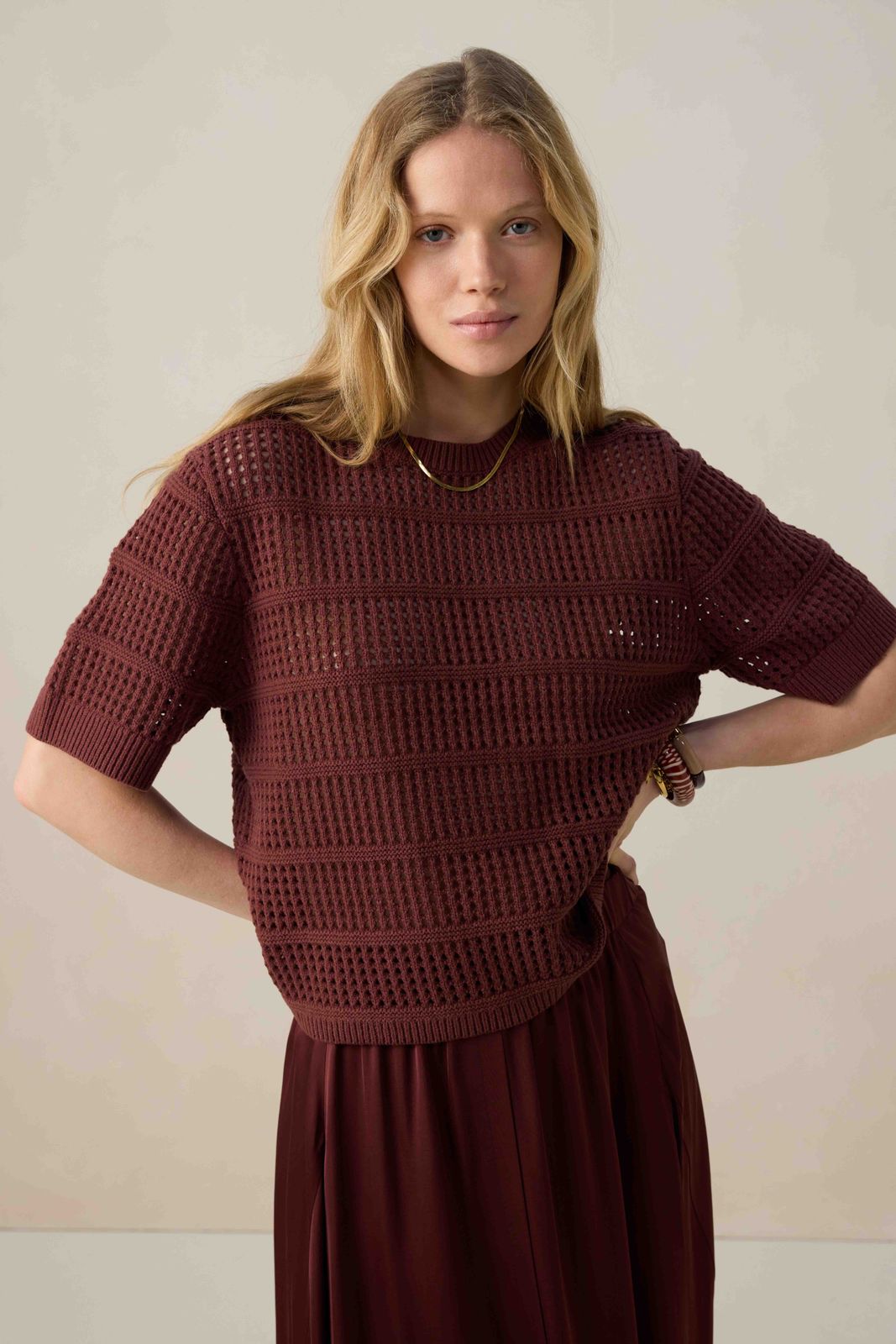 Donkerrode gebreide trui met korte mouwen