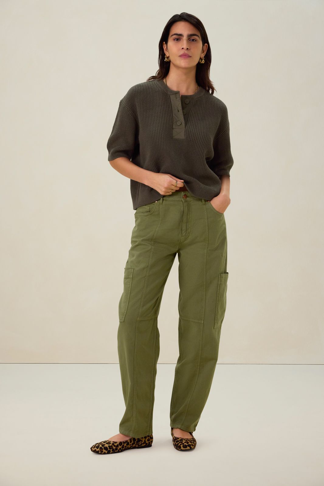 Donkergroene gebreide trui met knopen