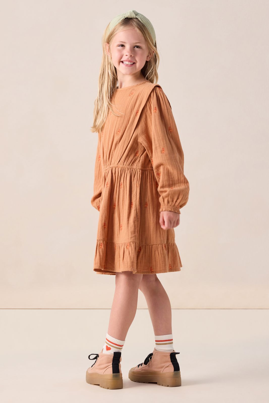 Lichtbruine jurk met flamingo embroidery