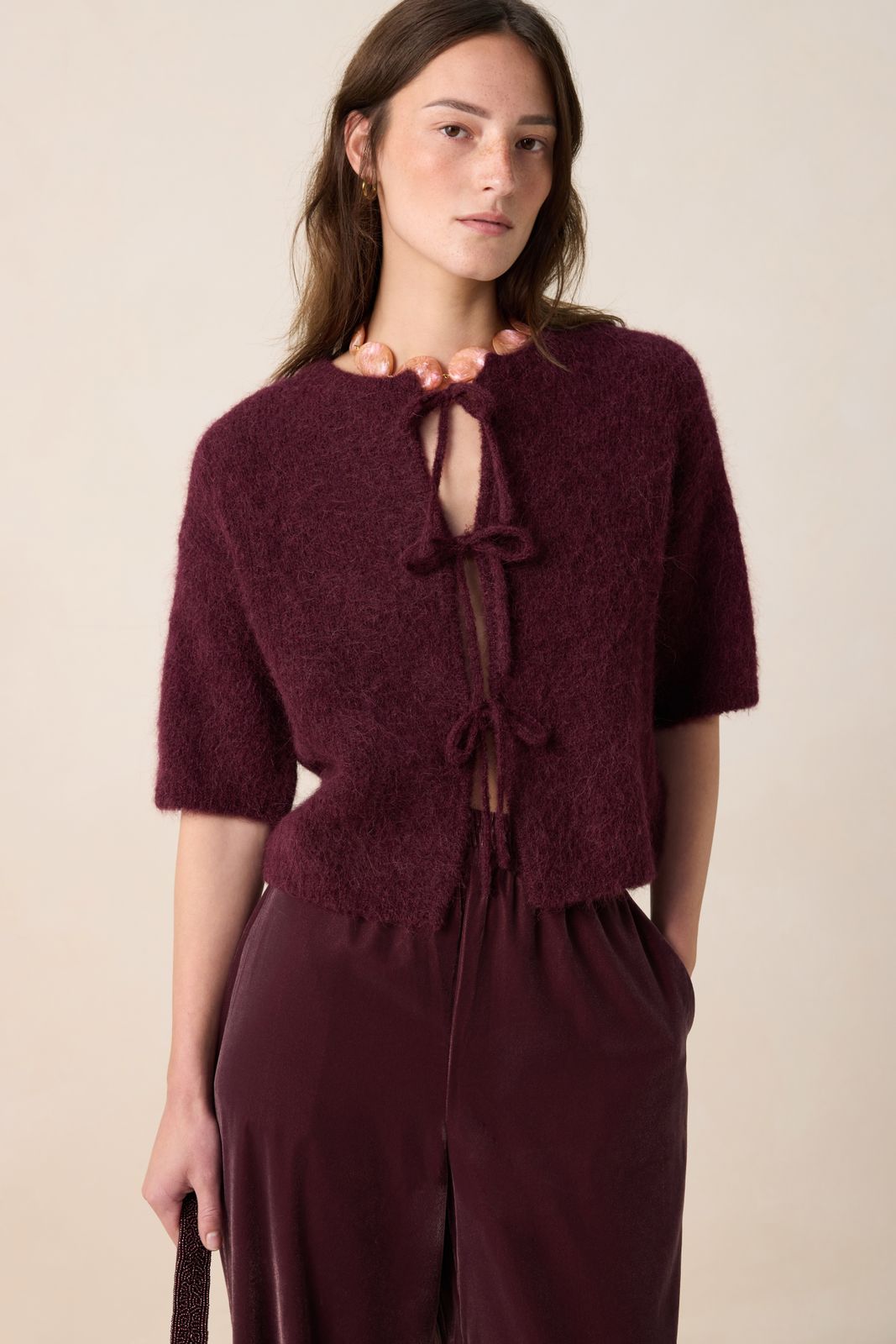 Donkerrood wollen vest met strikjes