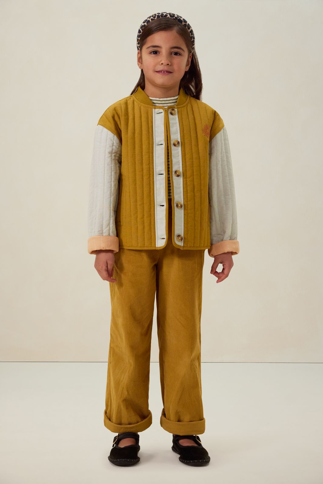 Donkergele quilted jas met embroidery